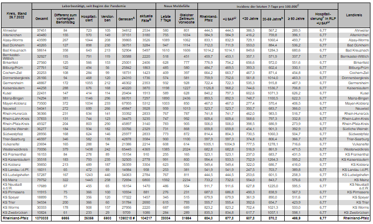 Coronavirus SARS-CoV-2: Fallzahlen für Rheinland-Pfalz, (Datenstand vom 26.07.2022, 14:10 Uhr)