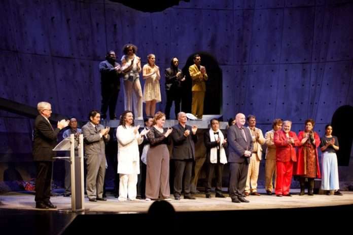 Dank an den scheidenden Intendanten: Bezirkstagsvorsitzender Theo Wieder (links) und Urs Häberli (Sechster von rechts) mit den „Salome“-Sängerinnen und -Sängern