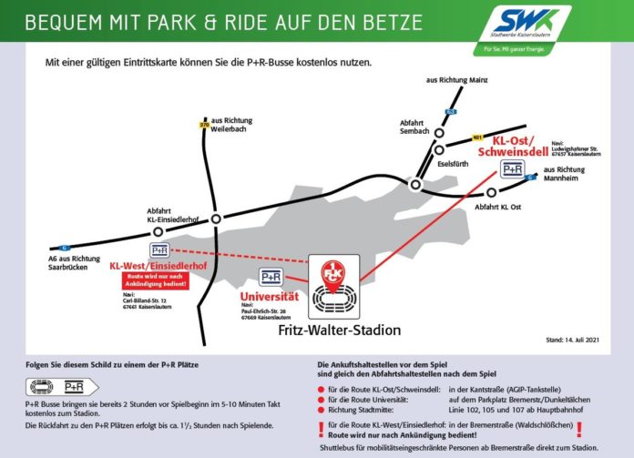 Die Polizei empfiehlt, den „Park & Ride“-Parkplatz Schweinsdell an der Autobahnabfahrt Kaiserslautern-Ost zu nutzen. Auch vom Gelände der Technischen Universität Kaiserslautern werden „Park & Ride“-Busse zum Stadion pendeln. Die Stadtwerke Kaiserslautern informieren unter https://www.swk-kl.de/produkte-services/busverkehr/bus-service/park-and-ride im Internet über den Shuttle-Betrieb von und zum Stadion. Informationen finden Sie auch unter https://fck.de/de/stadion/anfahrt auf der Internetseite des 1. FC Kaiserslautern.
