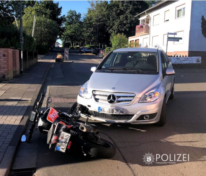 Mackenbach – Ein Auto und ein Motorrad sind am Dienstagmorgen in der Waldstraße zusammengestoßen. Offenbar hatte der 18-jährige Motorradfahrer die Rechts-vor-Links-Regel missachtet. Nach den derzeitigen Erkenntnissen war der 18-Jährige mit seiner Maschine in der Waldstraße in Fahrtrichtung Dansenberg unterwegs. Die 39-jährige Autofahrerin kam mit ihrem Mercedes-Benz aus der Jahnstraße und wollte nach links in die Waldstraße in Fahrtrichtung Triftstraße abbiegen. Dabei kam es jedoch zur Kollision mit dem jungen Mann auf dem Kleinkraftrad.