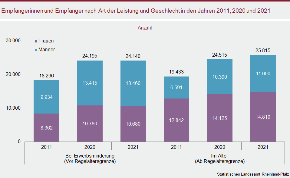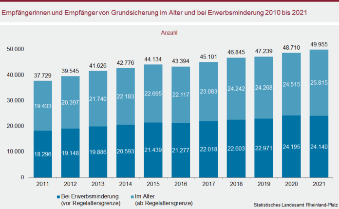 Ende 2021 erhielten in Rheinland-Pfalz insgesamt 49.955 Personen staatliche Leistungen der Grundsicherung im Alter und bei Erwerbsminderung nach dem Zwölften Sozialgesetzbuch. Wie das Statistische Landesamt in Bad Ems mitteilt stieg die Zahl der Leistungsbezieherinnen und Leistungsbezieher gegenüber dem Vorjahr um 1.245 bzw. 2,6 Prozent.