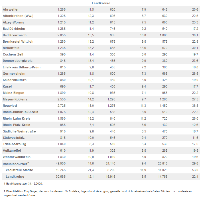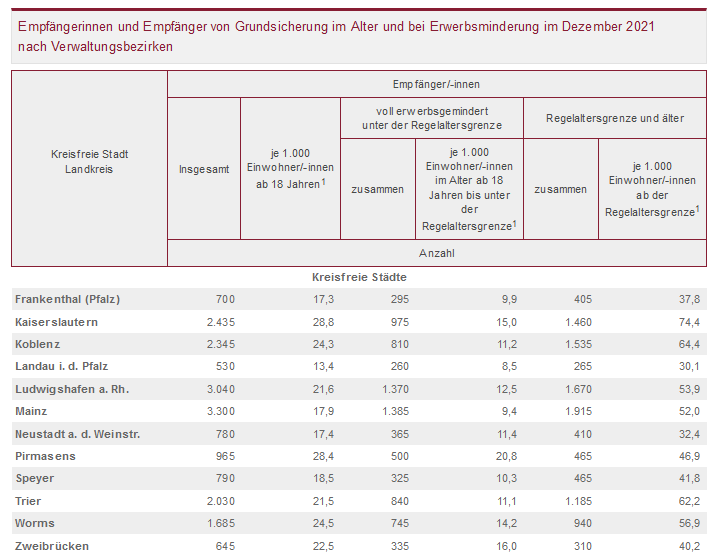 Regional zeigen sich große Unterschiede bei der Inanspruchnahme von Grundsicherung. So kamen in den kreisfreien Städten auf 1.000 volljährige Einwohnerinnen und Einwohner im Durchschnitt 21 Leistungsempfängerinnen und -empfänger, in den Landkreisen waren es dagegen nur zwölf. Werden ausschließlich Empfängerinnen und Empfänger von Grundsicherung im Alter betrachtet, so fallen die regionalen Unterschiede noch größer aus: Während in der Südwestpfalz lediglich rund zwölf Personen je 1.000 Einwohnerinnen und Einwohner oberhalb der Regelaltersgrenze die staatliche Leistung in Anspruch nahmen, waren es in der Stadt Kaiserslautern 74 Personen. Im Mittel aller Landkreise lag dieser Wert bei 22; in den kreisfreien Städten bezogen hingegen rund 53 Personen je 1.000 Einwohnerinnen und Einwohner oberhalb der Regelaltersgrenze Grundsicherungsleistungen.