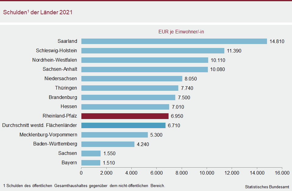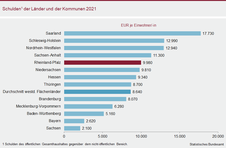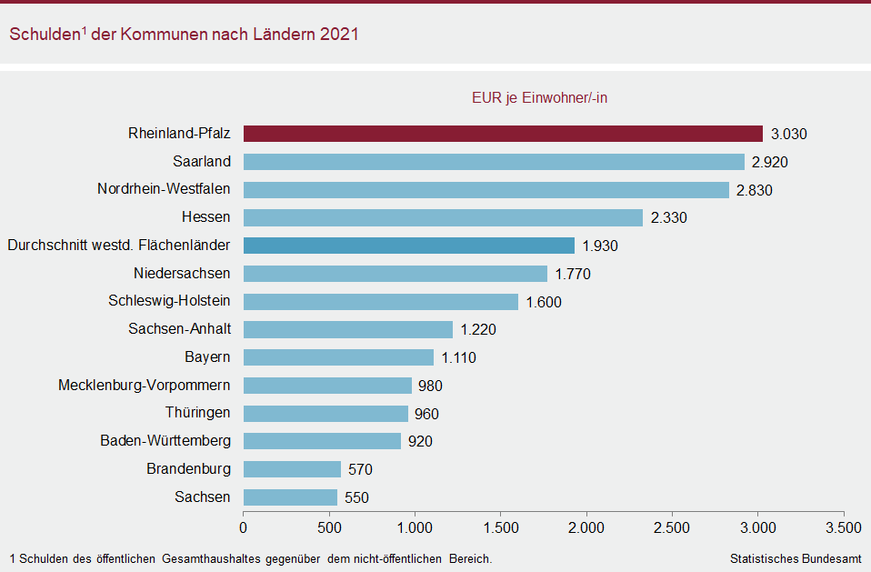Die Landesebene von Rheinland-Pfalz schneidet im Ländervergleich hingegen vergleichsweise gut ab. Unter den westdeutschen Flächenländern verbuchten lediglich die Landesregierungen in Baden-Württemberg und Bayern noch niedrigere Pro-Kopf-Schulden.