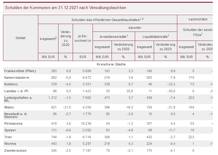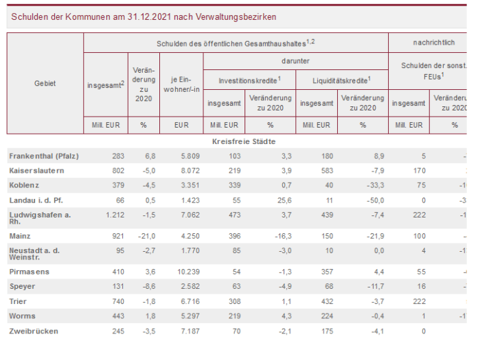Im Vergleich der kreisfreien Städte sanken die Schulden in der Landeshauptstadt Mainz am deutlichsten. Hier ging die Verschuldung um 240 Millionen Euro bzw. 21 Prozent zurück. Das war der deutlichste absolute Schuldenabbau einer rheinland-pfälzischen Kommune innerhalb eines Jahres, den die Statistiker in ihren Aufzeichnungen seit 1970 finden konnten.