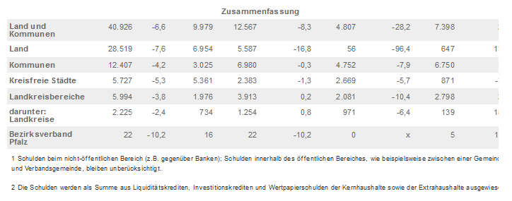 Für die Landkreisbereiche (Kreis inklusive der zugehörigen Verbands- und Ortsgemeinden) reduzierte sich Schuldenstand um 3,8 Prozent auf knapp 6 Milliarden Euro. Pro Kopf sanken die Schulden um fast 100 Euro auf rund 2.000 Euro.
