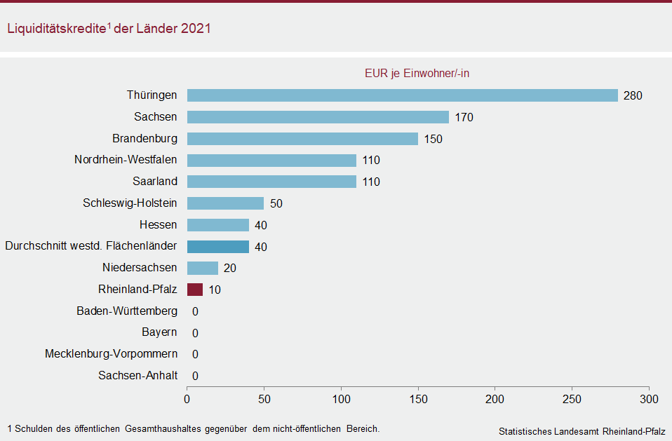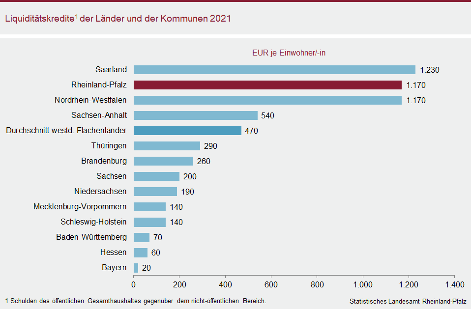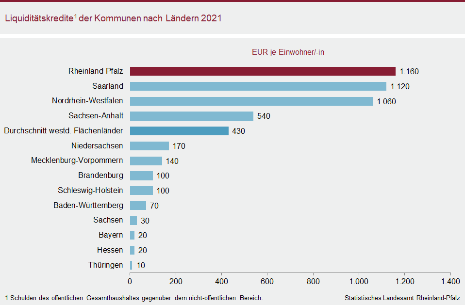 Das Land sowie die kommunalen Gebietskörperschaften können sich grundsätzlich durch Investitionskredite, Liquiditätskredite und Wertpapierkredite verschulden. Auch wenn die Liquiditätskredite grundsätzlich nur zur Überbrückung von vorübergehenden Kassenanspannungen gedacht waren, ist ihr Anteil an der Gesamtverschuldung der Kommunen hoch. Bei den kreisfreien Städten bestand Ende 2021 rund 47 Prozent ihrer Gesamtverschuldung aus kurzfristigen Liquiditätskrediten (2020: ebenfalls 47 Prozent); beim Landkreisbereich betrug der Anteil 35 Prozent (2020: 37 Prozent).
