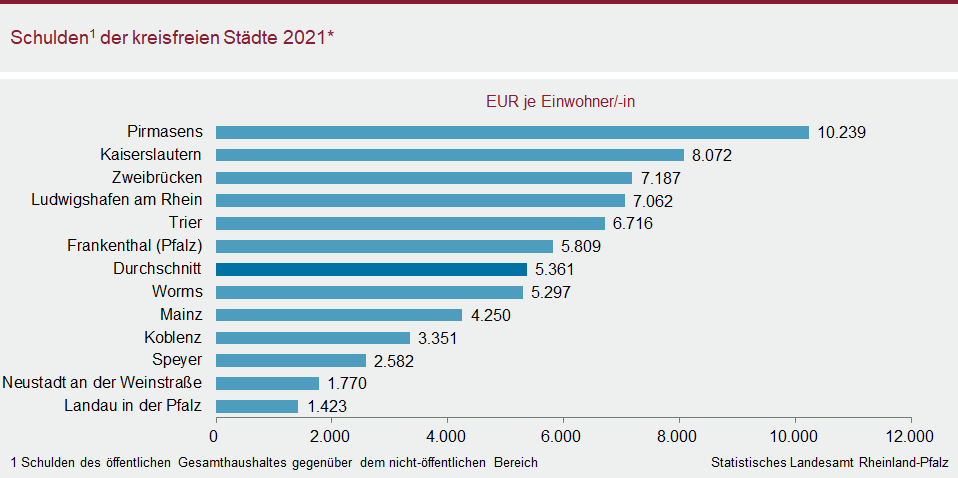 Zwischen den verschiedenen Regionen sind zum Teil deutliche Unterschiede festzustellen. Bei den kreisfreien Städten reicht die Spanne von Landau in der Pfalz mit rund 1.420 Euro bis zu Pirmasens, für die mit 10.240 Euro die höchste Pro-Kopf-Verschuldung ermittelt wurde.