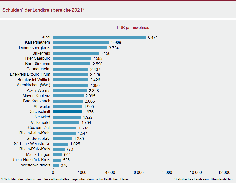 Für die Landkreishaushalte (Kreise ohne zugehörige Verbands- und Ortsgemeinden) lag der Schuldenstand bei insgesamt rund 2,2 Milliarden Euro; dies ist ein Rückgang um 2,4 Prozent. Je Einwohnerin bzw. Einwohner waren das 730 Euro. Wie in den Jahren zuvor wies Mainz-Bingen den niedrigsten Wert auf: Erneut war der Kreishaushalt dieses Landkreises schuldenfrei. Auch bei den Landkreishaushalten nahm der Landkreis Kusel das andere Ende der Skala ein: Die Schulden des Kreishaushalts lagen bei rund 2.920 Euro je Einwohnerin bzw. Einwohner. Hier nahm die Spannweite zwischen dem Kreishaushalt mit den geringsten und dem mit den höchsten Schulden ebenfalls zu.