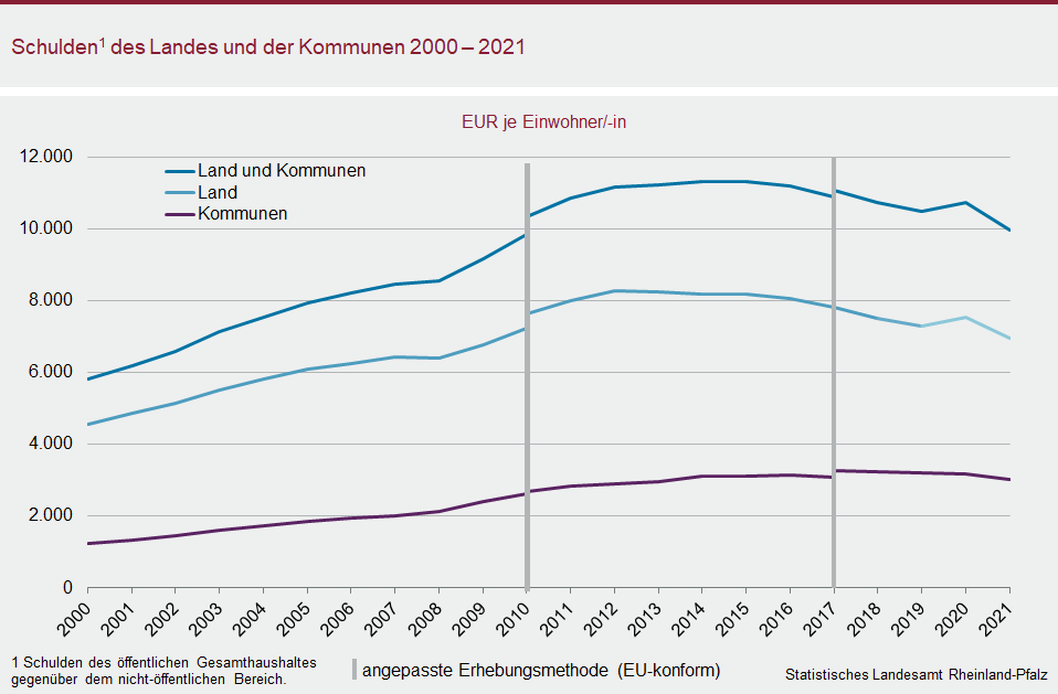 Seit dem Jahr 2000 stieg die Pro-Kopf-Verschuldung des Landeshaushalts um 50 Prozent. Bei den Kommunen erhöhte sich der Wert im gleichen Zeitraum um 117 Prozent. Für das Land und die Kommunen zusammen ergab dies einen Schuldenzuwachs von 65 Prozent gegenüber 2000. Zum Vergleich: Im selben Zeitraum wuchs das Bruttoinlandsprodukt je Einwohnerin bzw. Einwohner in Rheinland-Pfalz um 70 Prozent.