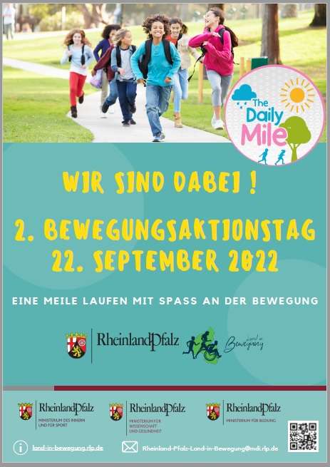 Nach der erfolgreichen Veranstaltung im letzten Jahr, mit über 26.000 teilnehmenden Kindern aus rund 360 Institutionen, ruft die Landesinitiative „Rheinland-Pfalz – Land in Bewegung“ gemeinsam mit ihrer Partnerorganisation „The Daily Mile“ am 22. September 2022 zum 2. landesweiten Bewegungsaktionstag auf. Eingeladen sind alle rheinland-pfälzischen Kindertagesstätten, Grund- und Förderschulen. Die Kinder aller teilnehmenden Institutionen in Rheinland-Pfalz sollen an diesem Tag eine Meile (1,6 km) laufen oder 15 Minuten in Bewegung sein. Die Teilnahme ist einfach und setzt ein wertvolles Zeichen für die Bewegung im Kindesalter. Die Institutionen sind frei in der Einbindung der 15-minütigen Bewegungseinheit.