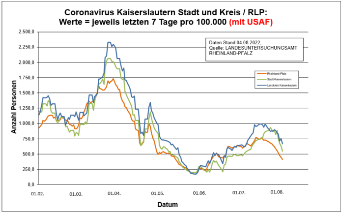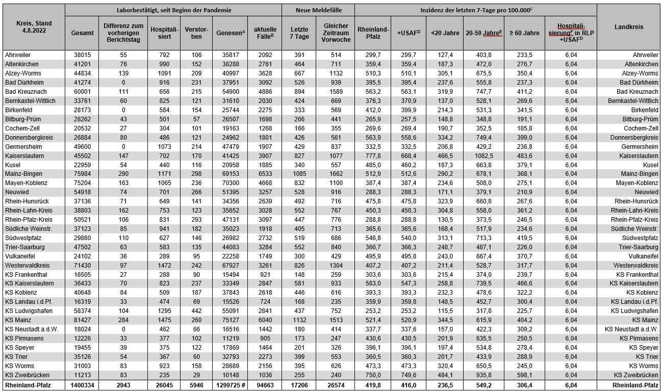 Coronavirus SARS-CoV-2: Fallzahlen für Rheinland-Pfalz, (Datenstand vom 04.08.2022, 14:10 Uhr)