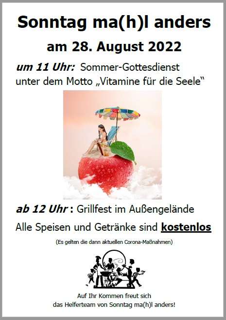 Am Sonntag, 28. August 2022 lädt das Helferteam von „Sonntag ma(h)l anders“ zum Grillfest ab 12 Uhr an die Christuskirche (Am Heiligenhäuschen 11) ein. Im Vordergrund bei der Aktion „Sonntag ma(h)l anders“ steht das zwanglose Zusammenkommen bei kostenfreiem Essen und Trinken. Es geht dabei um Gemeinschaft, Austausch und Miteinander von Menschen unterschiedlichen Alters, Herkunft und sozialer Zugehörigkeit. Um 11 Uhr beginnen wir mit einem Sommergottesdienst unter dem Motto „Vitamine für die Seele“ (der Besuch am Gottesdienst ist natürlich nicht verpflichtend für die anschließende Teilnahme am Grillfest). Wir freuen uns auf Ihr Kommen! (Es gelten die dann aktuellen Corona-Maßnahmen)