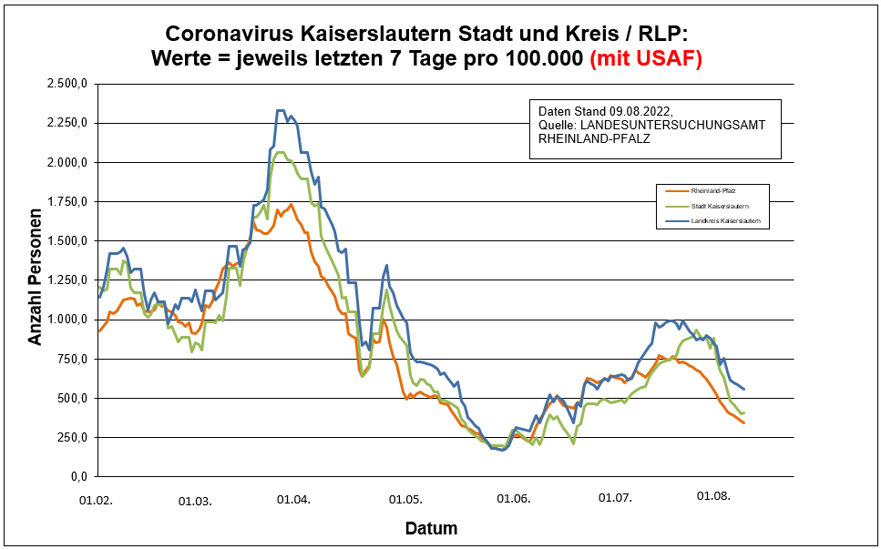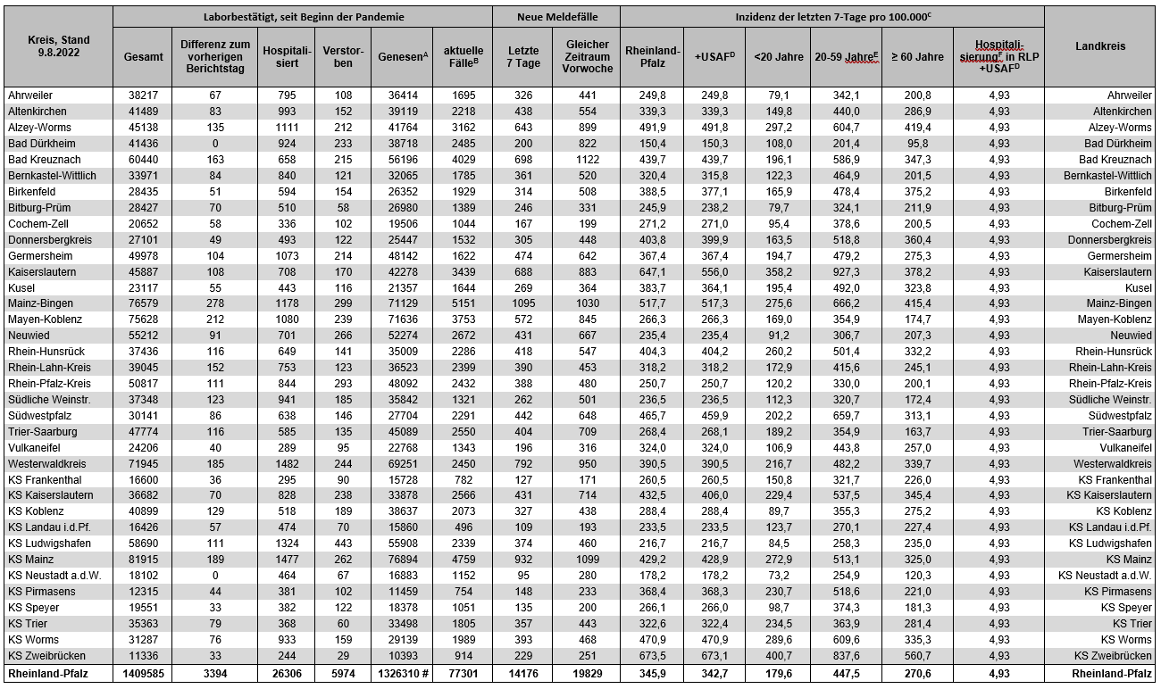 Coronavirus SARS-CoV-2: Fallzahlen für Rheinland-Pfalz, (Datenstand vom 09.08.2022, 14:10 Uhr)