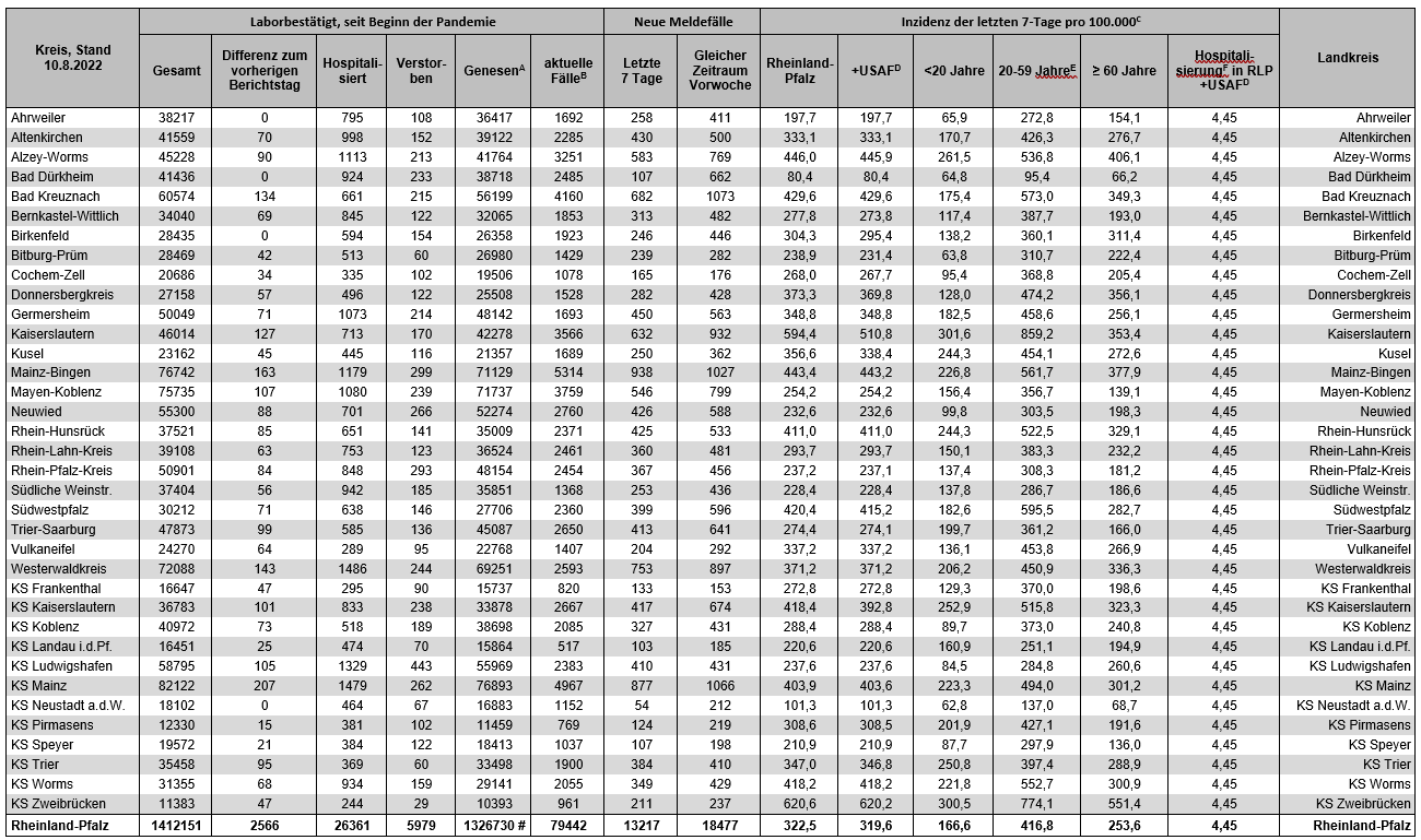 Coronavirus SARS-CoV-2: Fallzahlen für Rheinland-Pfalz, (Datenstand vom 10.08.2022, 14:10 Uhr)