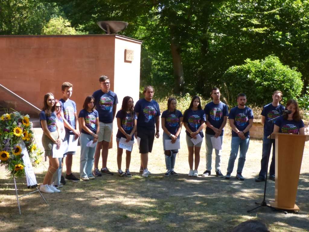 Anschließend fassten Helen Specht aus Deutschland sowie Joele Attianese, Italien, die Gedanken der Jugendlichen zu Krieg und Frieden, über das Gelernte der letzten Tage und die Verantwortung aller Menschen für ein friedvolles Miteinander zusammen. Danach lasen die Teilnehmenden in ihrer eigenen Landessprache ihre ganz persönliche Friedensbotschaft vor. Den Abschluss bildeten das gemeinsame Gedenken vor dem Kranz am Mahnmal auf dem Ehrenfriedhof und der Besuch der Gräber, auf denen die Anwesenden in kleinen Gruppen Blumen niederlegten.