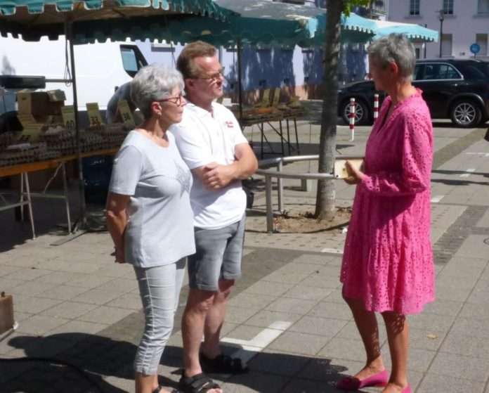 Neben den Kontakten mit den Bürgerinnen und Bürgern suchte Beate Kimmel auch das Gespräch mit den Beschickerinnen und Beschickern des Wochenmarktes, von denen aktuell einige in Urlaub sind. Hier wurde insbesondere die leicht rückläufige Kundenfrequenz und Möglichkeiten zur Attraktivitätssteigerung eines Wochenmarktbesuches thematisiert.