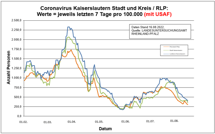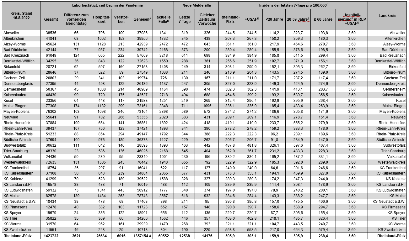 Coronavirus SARS-CoV-2: Fallzahlen für Rheinland-Pfalz, (Datenstand vom 16.08.2022, 14:10 Uhr)