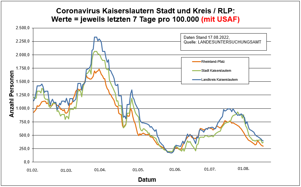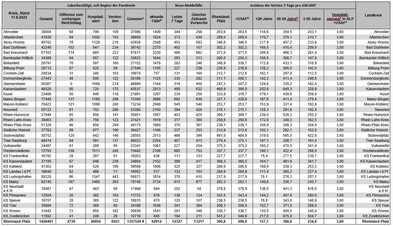 Coronavirus SARS-CoV-2: Fallzahlen für Rheinland-Pfalz, (Datenstand vom 17.08.2022, 14:10 Uhr)