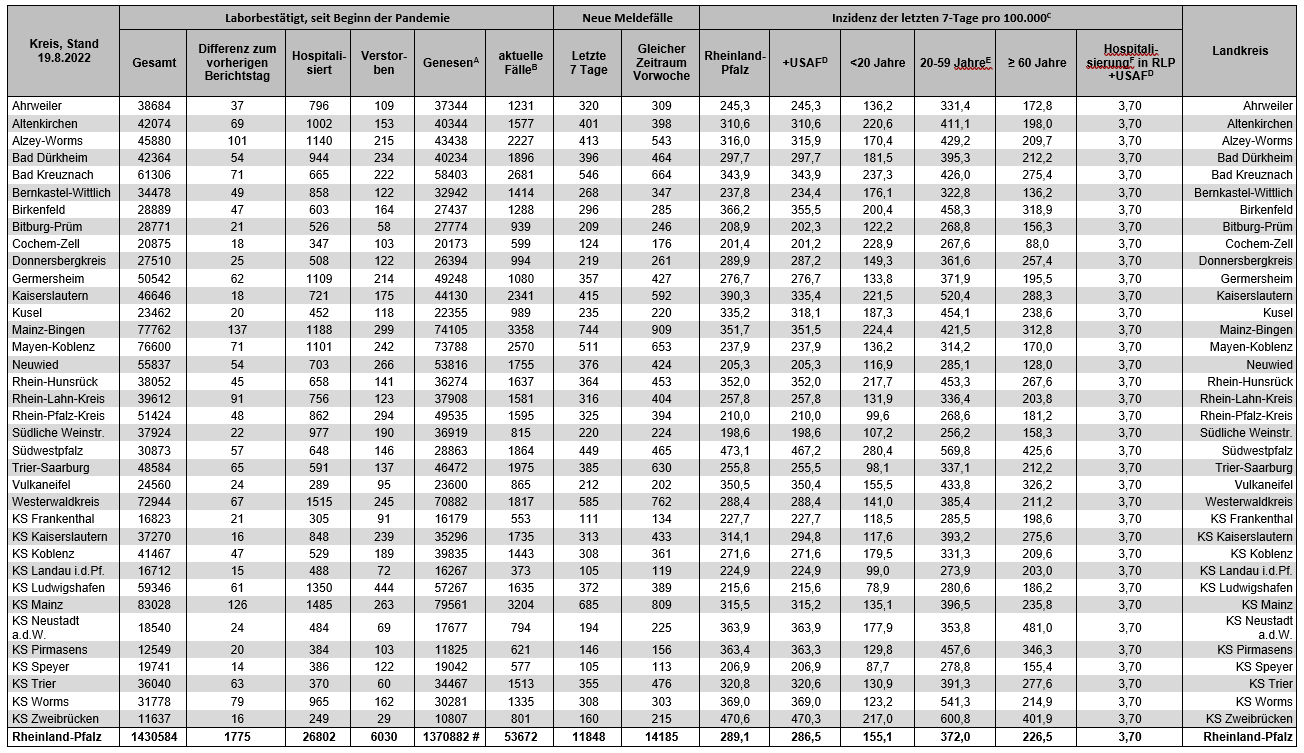Coronavirus SARS-CoV-2: Fallzahlen für Rheinland-Pfalz – (Datenstand vom 19.08.2022, 14:10 Uhr)