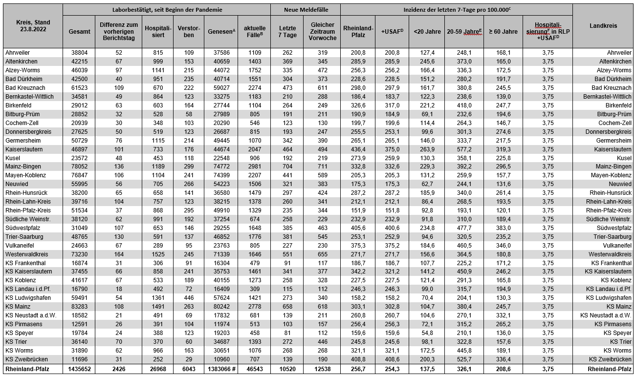 Coronavirus SARS-CoV-2: Fallzahlen für Rheinland-Pfalz, (Datenstand vom 23.08.2022, 14:10 Uhr)