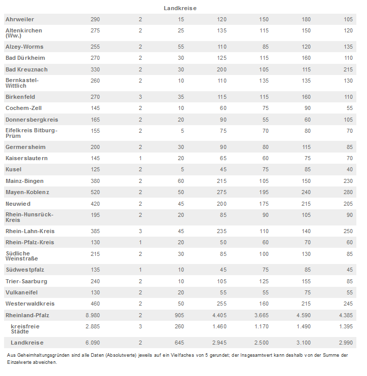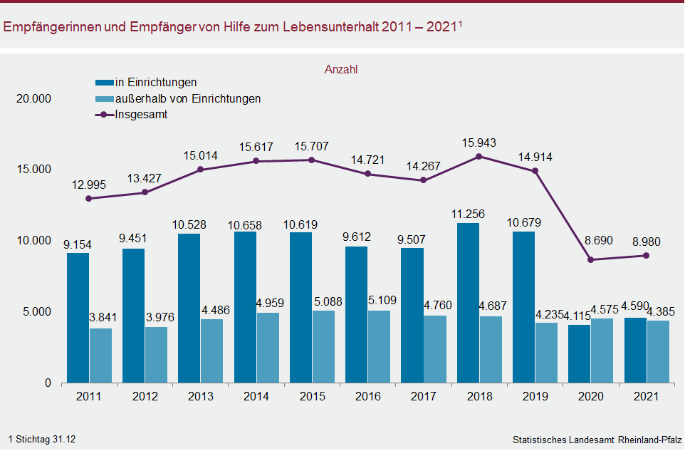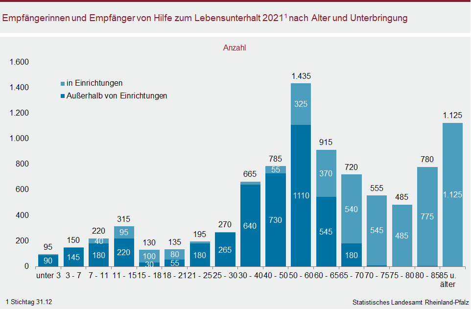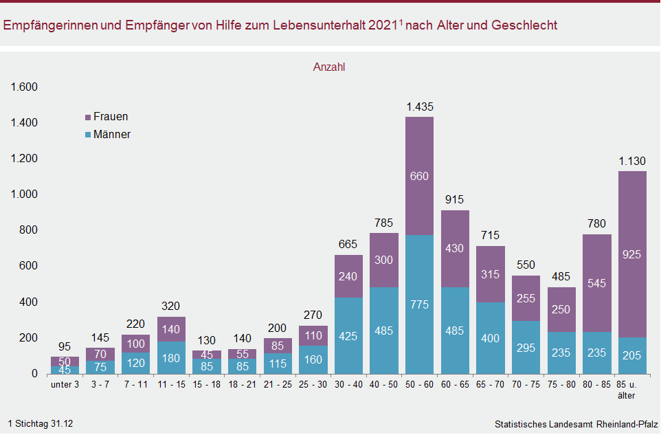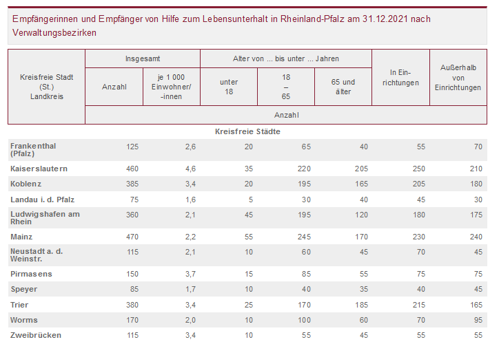 Ende 2021 kamen auf 1.000 Einwohnerinnen und Einwohner 2,2 Menschen mit Bezug von Hilfe zum Lebensunterhalt. In den kreisfreien Städten fiel dieser Wert mit 2,7 Personen höher aus als in den Landkreisen (2,0). Die Spannweite reicht dabei von 0,8 Empfängerinnen oder Empfänger im Rhein-Pfalz-Kreis bis 4,6 in der Stadt Kaiserslautern.