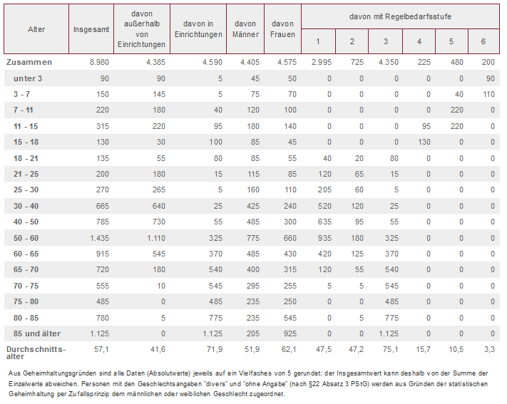 Das Durchschnittsalter aller Empfängerinnen und Empfänger betrug 57 Jahre, wobei Personen in Einrichtungen (72 Jahre) im Durchschnitt deutlich älter waren als solche, die außerhalb von Einrichtungen lebten (42 Jahre). Auch zwischen den Geschlechtern waren Unterschiede in der Altersstruktur feststellbar: Weibliche Hilfebedürftige (62 Jahre) waren im Mittel zehn Jahre älter als männliche (52 Jahre).