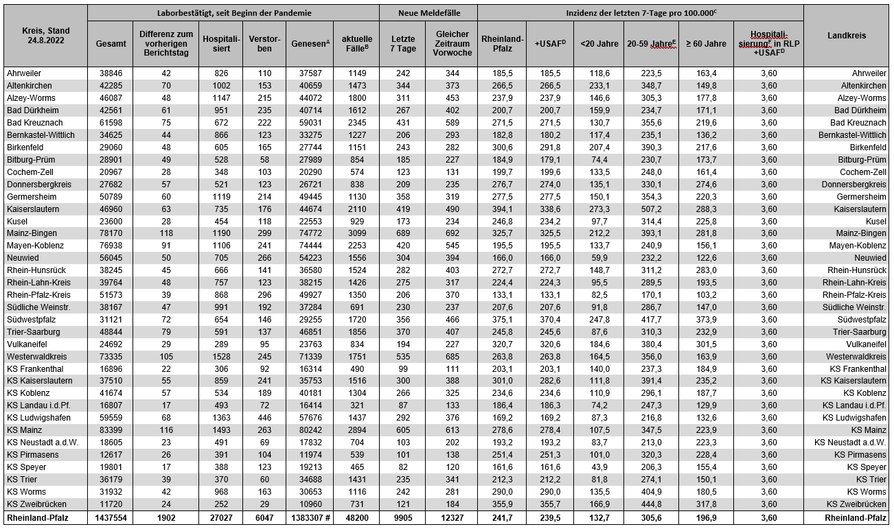 Coronavirus SARS-CoV-2: Fallzahlen für Rheinland-Pfalz, (Datenstand vom 24..08.2022, 14:10 Uhr)