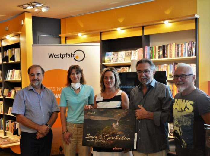 • Kalenderpräsentation mit Dr. Hans-Günther Clev (Geschäftsführer ZukunftsRegion Westpfalz e.V.), Simone Grub (kaufmännische Direktorin Pfalztheater), Karin Schliermann (Filialleiterin Thalia Kaiserslautern), Harald Kröher (Fotograf) und
