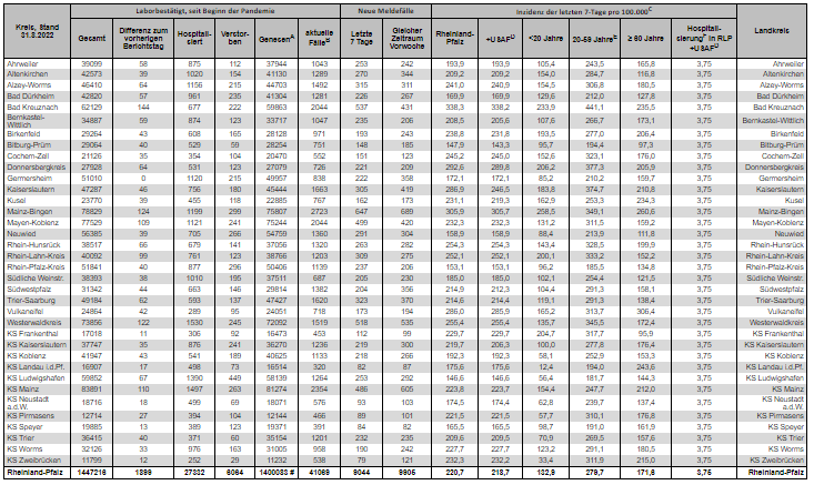 Coronavirus SARS-CoV-2: Fallzahlen für Rheinland-Pfalz, (Datenstand vom 31.08.2022, 14:10 Uhr)