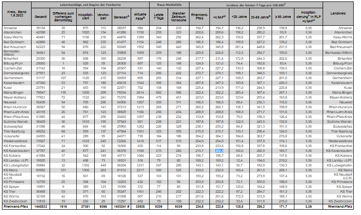 Coronavirus SARS-CoV-2: Fallzahlen für Rheinland-Pfalz, (Datenstand vom 01.09.2022, 14:10 Uhr)