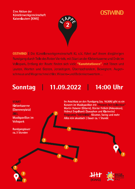 Der Osten Kaiserslauterns ist kein homogenes Stadtgefüge, sondern ist geprägt von unterschiedlichsten Bereichen. Da gibt es u.a. den Volkspark mit dem anschließenden Wohngebiet, den Hauptfriedhof, den Freizeitbereich mit Freibad und Schrebergärten und drei Kasernen, die seit Kriegsende unter amerikanischem Befehl stehen. Dies also soll die Spielwiese der Künstlerwerkgemeinschaft und ihren Gästen werden, mit Aktionen, Interventionen, Performances und geführtem Rundgang durchs Viertel. Kunst in verschiedensten Erscheinungsformen kann stattfinden, zum Staunen und Lauschen, zum Partizipieren und Diskutieren – temporär und ohne materielle Spuren zu hinterlassen. So als ob der Wind einmal durchgefegt wäre.
