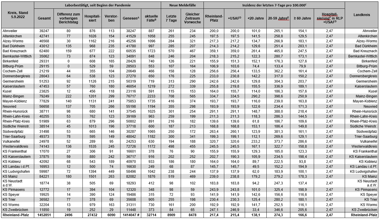 Coronavirus SARS-CoV-2: Fallzahlen für Rheinland-Pfalz, (Datenstand vom 05.09.2022, 14:10 Uhr)