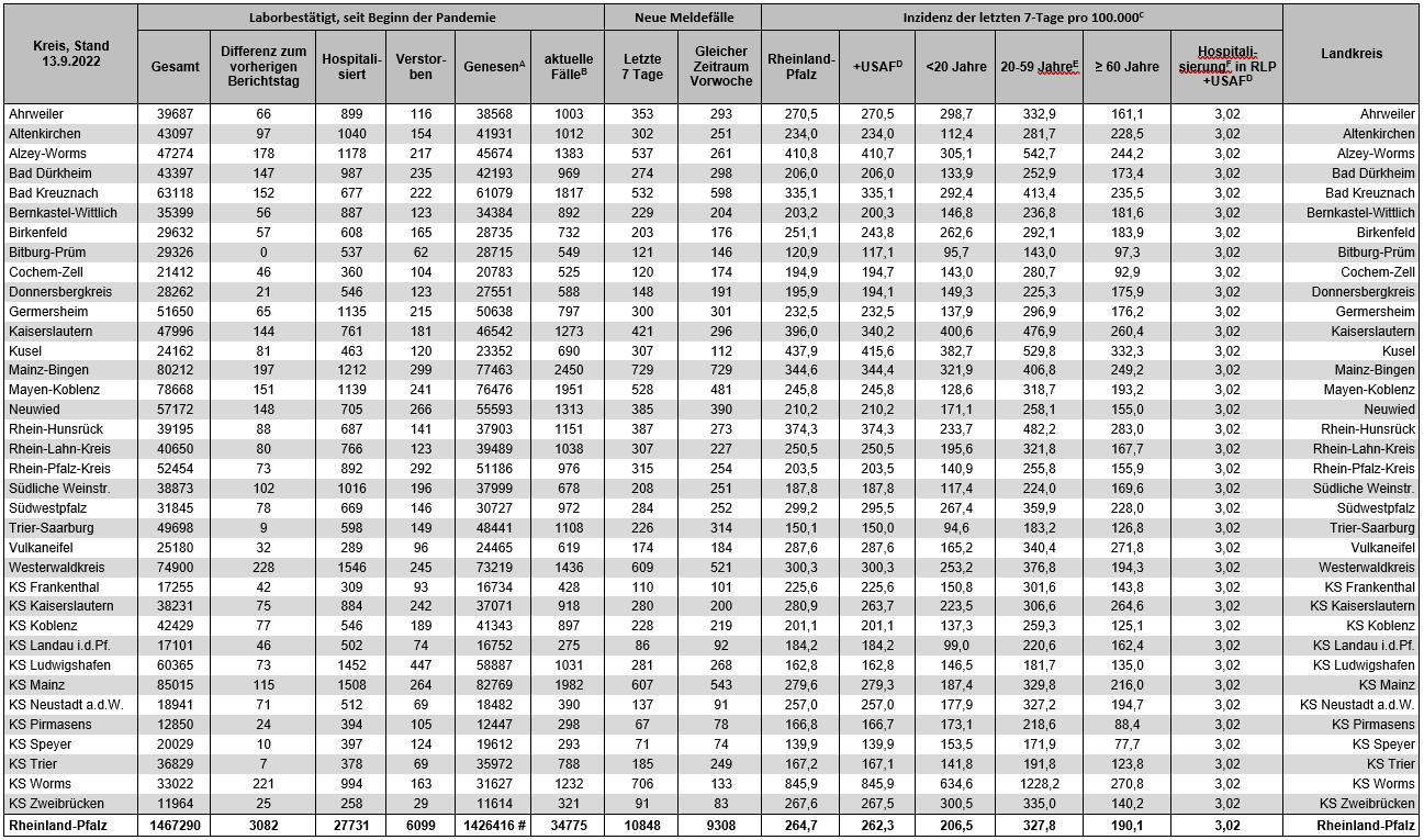Coronavirus SARS-CoV-2: Fallzahlen für Rheinland-Pfalz, (Datenstand vom 13.09.2022, 14:10 Uhr)