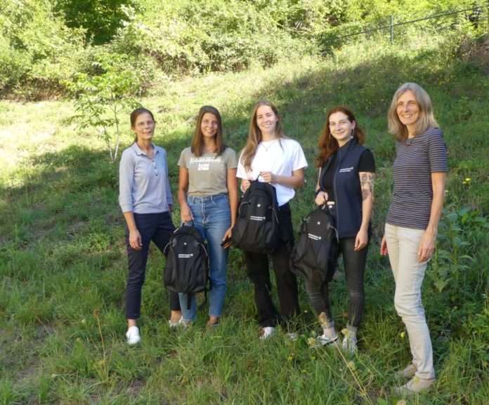 Ulrike Eisenacher, Pressesprecherin der Region Mitte bei der Commerzbank, die Umweltpraktikantinnen Alexandra Brion, Lea Gemmecke und Rachel O’Shea, sowie Antje van Look, zuständig für das Umweltpraktikum beim Biosphärenreservat Pfälzerwald (v. l. n. r.) (Foto: Biosphärenreservat/frei)