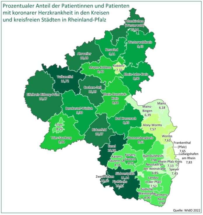 Koronare Herzkrankheit in Rheinland-Pfalz häufiger als im bundesweiten Durchschnitt. Gesundheitsatlas des Wissenschaftlichen Instituts der AOK (WIdO) zeigt regionale Unterschiede innerhalb des Landes und schafft Transparenz über Ursachen, Verbreitung und Folgen von Koronalen Herzkrankheiten.