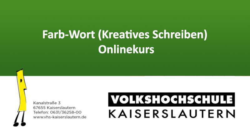Die Volkshochschule Kaiserslautern bietet am Mittwoch, dem 19.10.2022 von 19:30-21:00 Uhr einen online-Kurs “Farb-Wort Kreatives Schreiben“ an. Die VHS Dozentin Silke Leimann vermittelt in dem Online-Kurs einen Raum zu schaffen, an dem die Teilnehmer*innen ganz freiwillig und zwanglos die Kreativität hervor zu kitzeln und am Ende ein paar selbstgeschriebene Zeilen beziehungsweise Texte in Händen zu halten. Es gibt kein Richtig und kein Falsch, hier darf (fast) alles und muss gar nichts. Es kommen einige Übungen und Impulse zu Anwendung, die dabei helfen werden, in den kreativen Fluss zu finden. Informationen Anmeldung bei der Volkshochschule Kaiserslautern in der Kanalstraße 3, 67655 Kaiserslautern, Tel. 0631-36258-16, bzw. per email: info@vhs-kaiserslautern.de, oder auch persönlich zu den Öffnungszeiten der Volkshochschule Kaiserslautern.