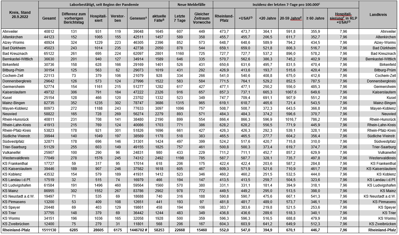 Coronavirus SARS-CoV-2: Fallzahlen für Rheinland-Pfalz, (Datenstand vom 28.09.2022, 14:10 Uhr)