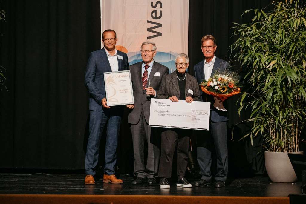 4) Kai Landes (neuer ZRW-Vorstandsvorsitzender), Karl-Hermann Seyl (Preisträger der Westpfalz Awards, Kategorie Ehrenpreis), Angelika Müller (Empfängerin Preisgeld, Hospizverein für Stadt und Landkreis Kaiserslautern e.V.), Dr. Gerhard F. Braun (ZRW. Kuratoriumsvorsitzender).