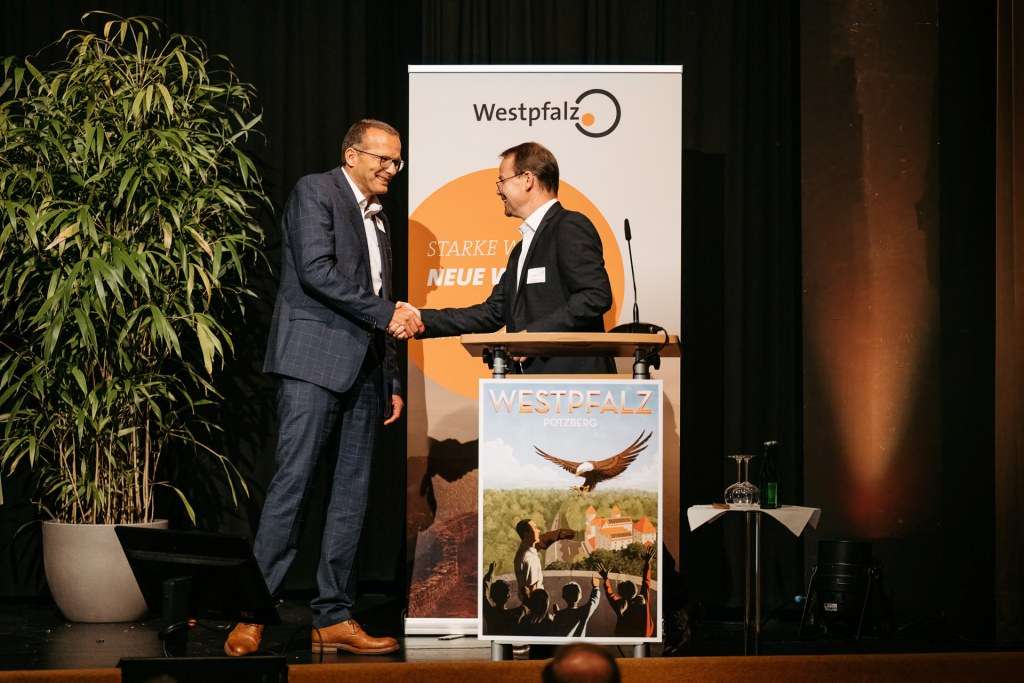 Feierlicher Höhepunkt des Abends war schließlich die Verleihung der Westpfalz Awards. In der Kategorie Zukunftspreis wurden die Zwillingsbrüder Frederic und Pascal Keller ausgezeichnet, Gründer des Startups „MEIN MUTIGER WEG“. Gemeinsam mit ihrem jungen Team haben sie seit der Unternehmensgründung vor vier Jahren über 24.000 Schülerinnen und Schüler bei ihrem Einstieg in das Berufsleben begleitet. Den Ehrenpreis erhielt Karl-Herrmann Seyl aus Bruchmühlbach-Miesau, ehemaliger Geschäftsführer des Ökumenischen Gemeinschaftswerks. Ausgezeichnet wurde er für seine lebenslangen sozialen Dienste und seinen besonderen Einsatz für Menschen mit Beeinträchtigungen.