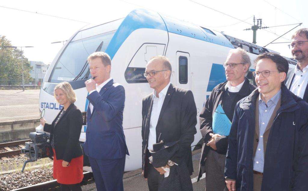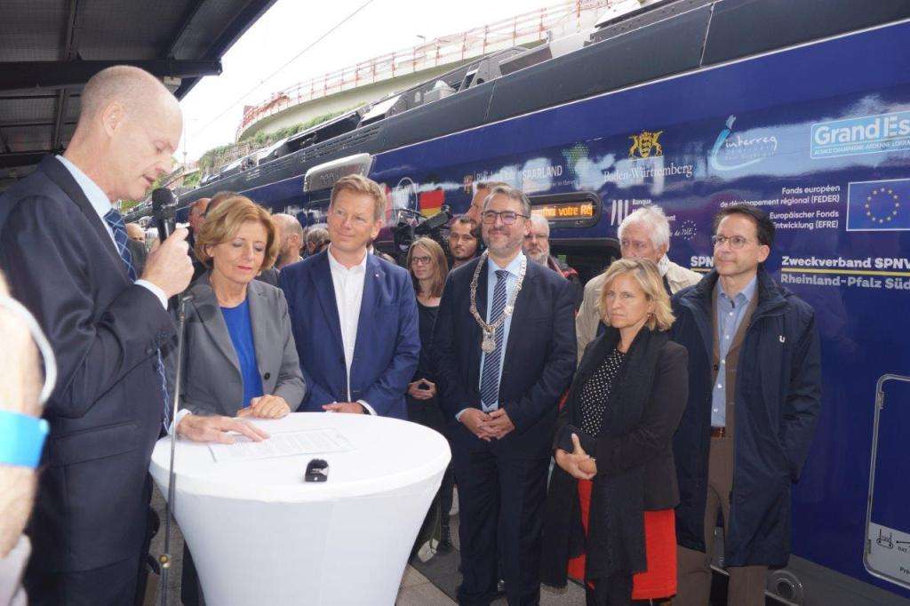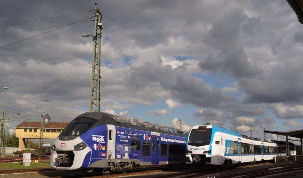 Der 140 km/h schnelle Zug vom Typ Flirt der Firma Stadler fuhr von Ludwigshafen über Schifferstadt nach Neustadt/W, wo er auf den Triebwagen vom Typ Coradia Polyvalent aus der Produktion von Alstom/CAF traf. Dort erläuterte Marc Ehret als Leiter des Produktionsstandortes Reichshoffen im Elsaß die Technik des für die künftigen grenzüberschreitenden Züge von Strasbourg nach Karlsruhe, Wörth und Neustadt/W bestellten Zuges.