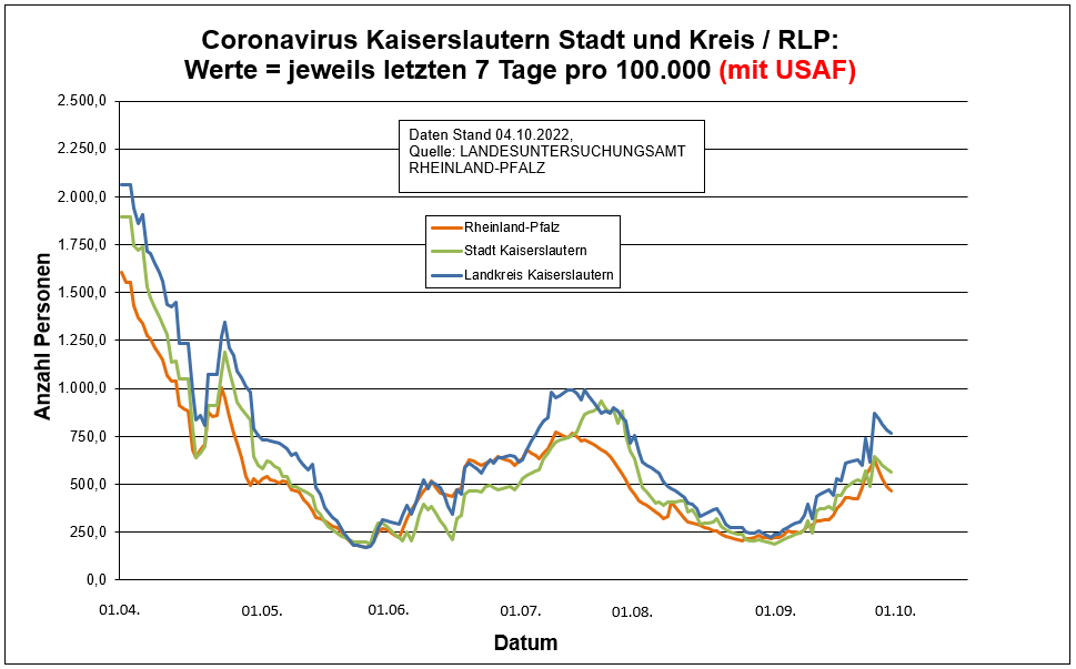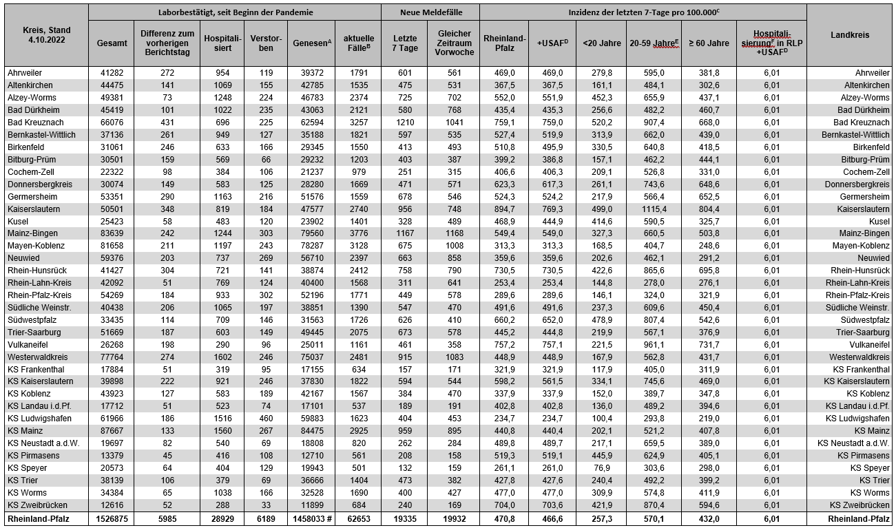 Coronavirus SARS-CoV-2: Fallzahlen für Rheinland-Pfalz, (Datenstand vom 04.10.2022, 14:10 Uhr)