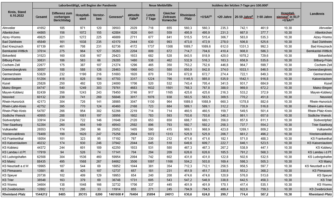 Coronavirus SARS-CoV-2: Fallzahlen für Rheinland-Pfalz, (Datenstand vom 06.10.2022, 14:10 Uhr)