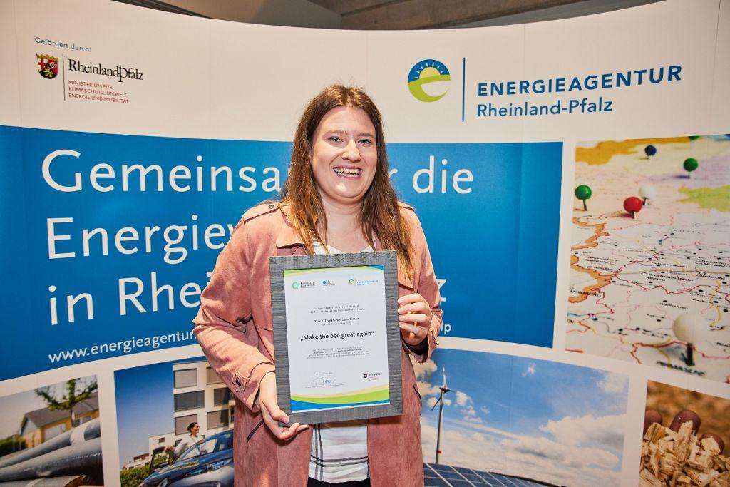 „Bienen retten, Klima schützen – Make the bee great again“ lautete das Motto eines Projekts, das der Bezirksverband Pfalz im Rahmen des bundesweiten Wettbewerbs „Kommunale Klimascouts“ durchgeführt hatte und das kürzlich in Mainz ausgezeichnet wurde. Lena Simon, Auszubildende in der Zentralverwaltung des Bezirksverbands Pfalz im dritten Lehrjahr, und Yara Yasmin Frankfurter, die dort ein freiwilliges soziales Jahr absolviert hat, hatten sich das Projekt und den Titel selbst ausgedacht. Sie wollten mit der Biene als Botschafterin für Artenvielfalt und Klimaschutz spielerisch für naturnahe (Grün-)Flächen werben und Alternativen zum „Schottergarten“ aufzeigen. Unter Leitung der Klimaschutzmanagerin des Bezirksverbands Pfalz, Carolin Sperk, wurde die Aktion mit rund 80 Schülerinnen und Schülern der dritten und vierten Klassen am Pfalzinstitut für Hören und Kommunikation (PIH) in Frankenthal durchgeführt. Nun wurden die drei besten Azubi-Projekte in Rheinland-Pfalz von Klimaschutzministerin Katrin Eder und dem Geschäftsführer der Energieagentur, Dr. Tobias Büttner, mit einer Urkunde geehrt. Neben dem Bienen-Projekt des Bezirksverbands Pfalz gab es noch je einen Preis für „Eco not Ego“ der Verbandsgemeinde Montabaur und „Upcycling-Dat es keen Mull“ der Stadt Neuwied.