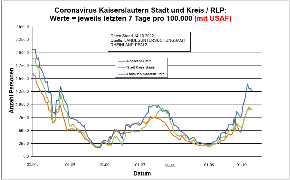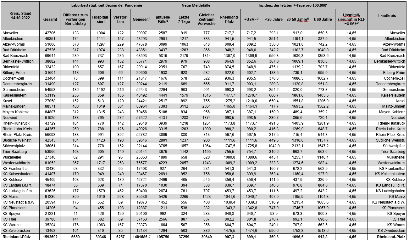 Coronavirus SARS-CoV-2: Fallzahlen für Rheinland-Pfalz, (Datenstand vom 14.10.2022, 14:10 Uhr)