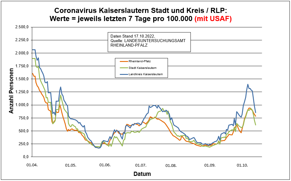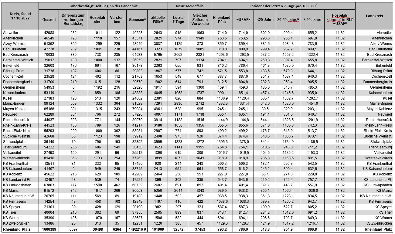 Coronavirus SARS-CoV-2: Fallzahlen für Rheinland-Pfalz, (Datenstand vom 17.10.2022, 14:10 Uhr)