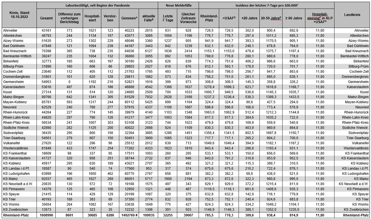 Coronavirus SARS-CoV-2: Fallzahlen für Rheinland-Pfalz, (Datenstand vom 18.10.2022, 14:10 Uhr)