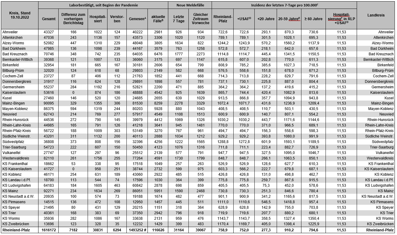 Coronavirus SARS-CoV-2: Fallzahlen für Rheinland-Pfalz, (Datenstand vom 19.10.2022, 14:10 Uhr)