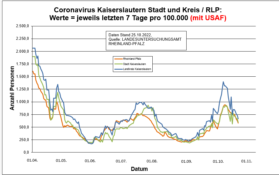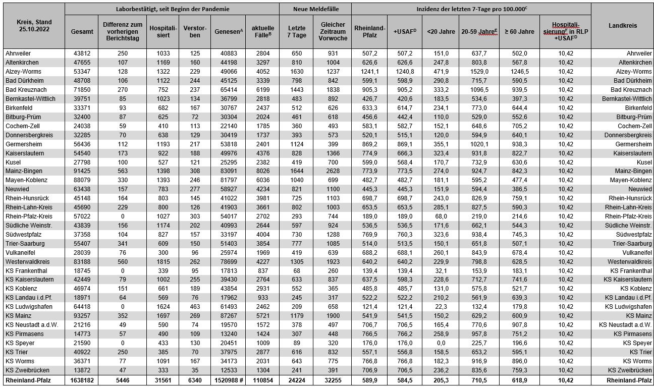 Coronavirus SARS-CoV-2: Fallzahlen für Rheinland-Pfalz, (Datenstand vom 25.10.2022, 14:10 Uhr)