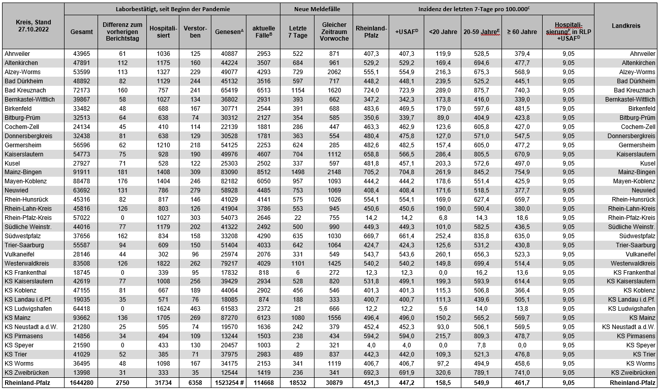 Coronavirus SARS-CoV-2: Fallzahlen für Rheinland-Pfalz, (Datenstand vom 27.10.2022, 14:10 Uhr)
