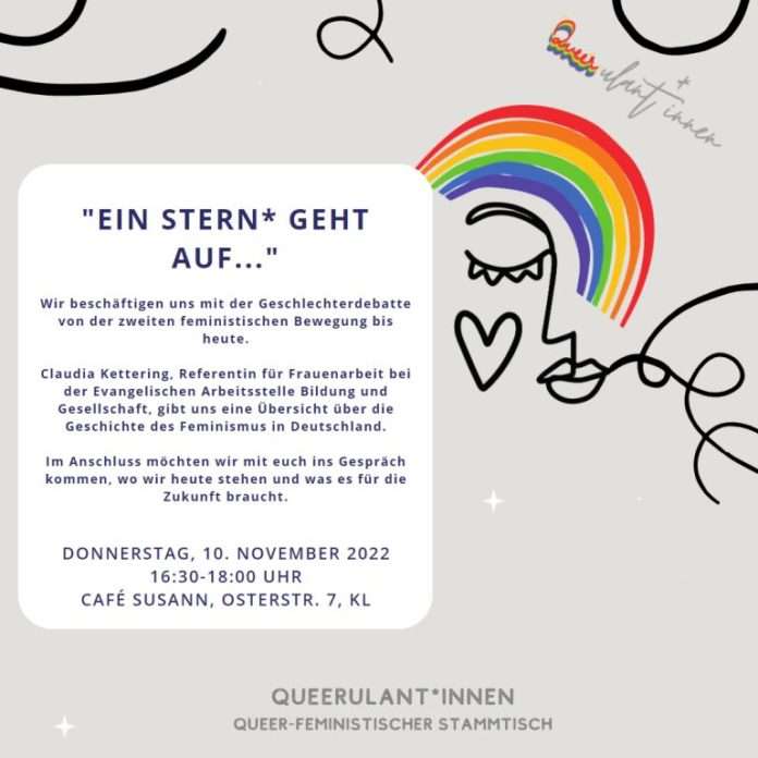 Die Queerulant*innen laden zu ihrem achten Stammtisch ein! Der queer-feministische Stamm-tisch trifft sich im November wieder in der Zeit von 16.30 bis 18.00 Uhr im Café Susann in der Osterstr. 7 in Kaiserslautern.